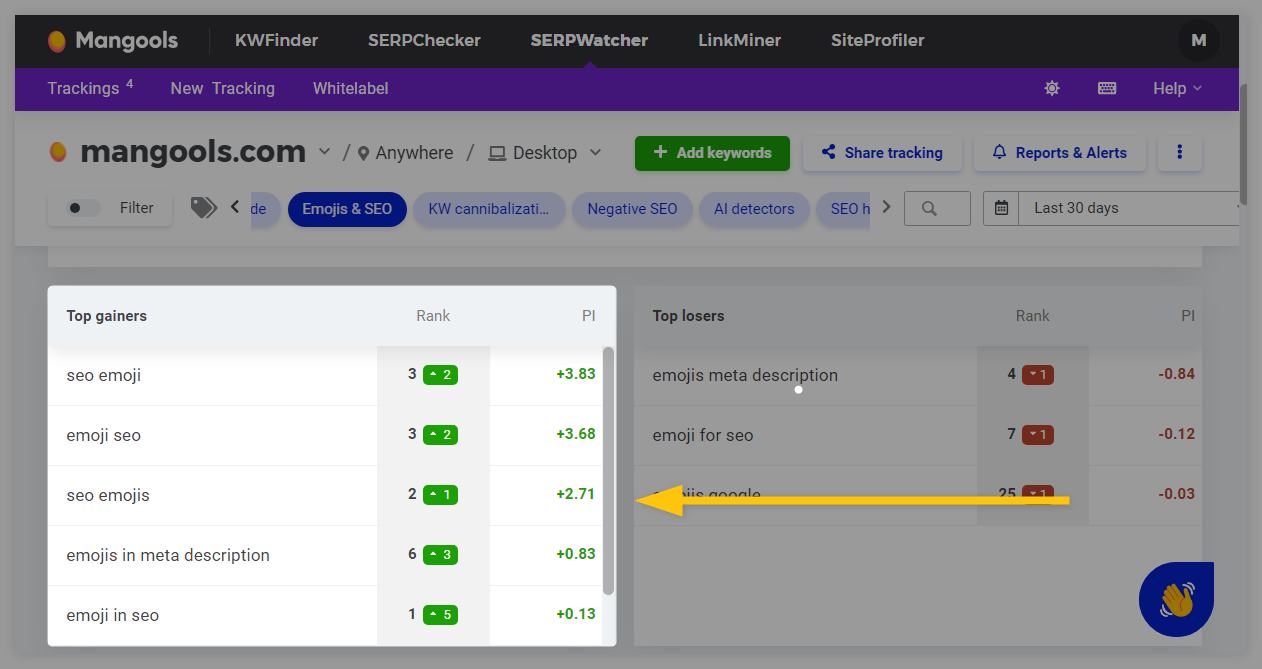 You can also use Mangools SERPWatcher to track the ranking position of your website for the selected long-tail keywords and queries, and see what the actual position of your pages is in Google Search